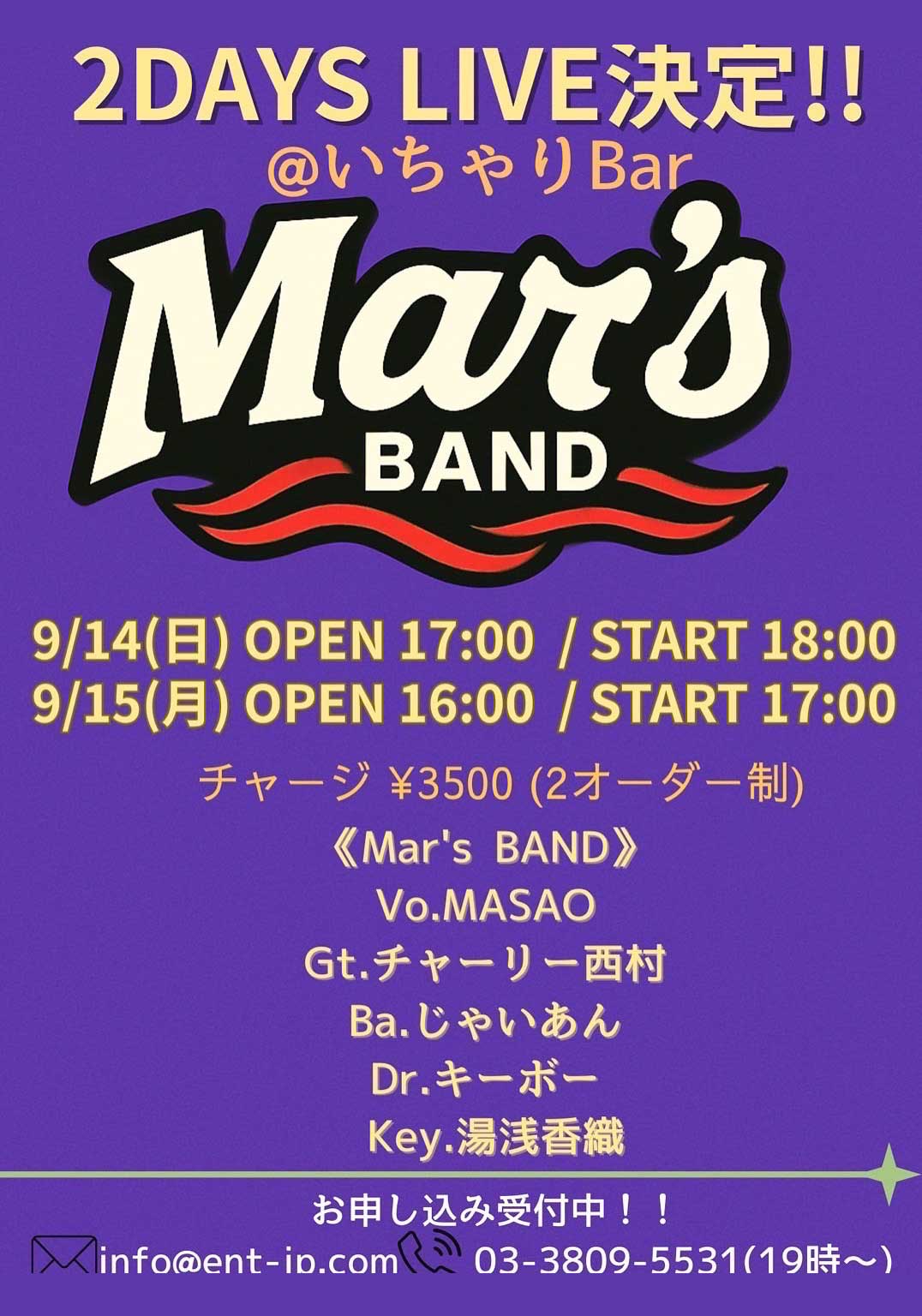 「2DAYS LIVE決定!! Mar's BAND」のお知らせ