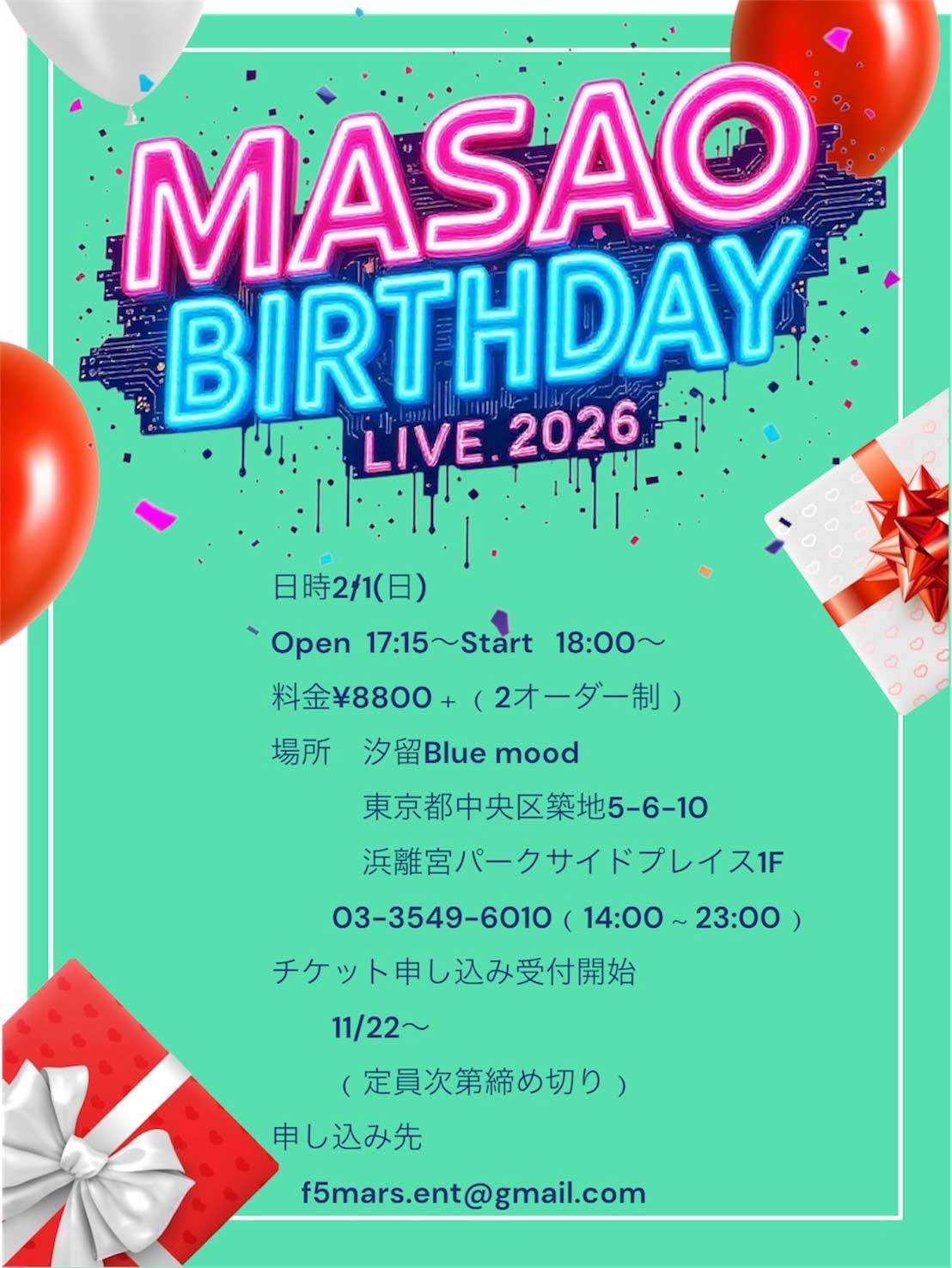 浜離宮パークサイドプレイス1F料金 8,800円(2オーダー制) 申し込み方法 件名に必ず「MASAO BIRTHDAY LIVE 2025」とご記入の上、