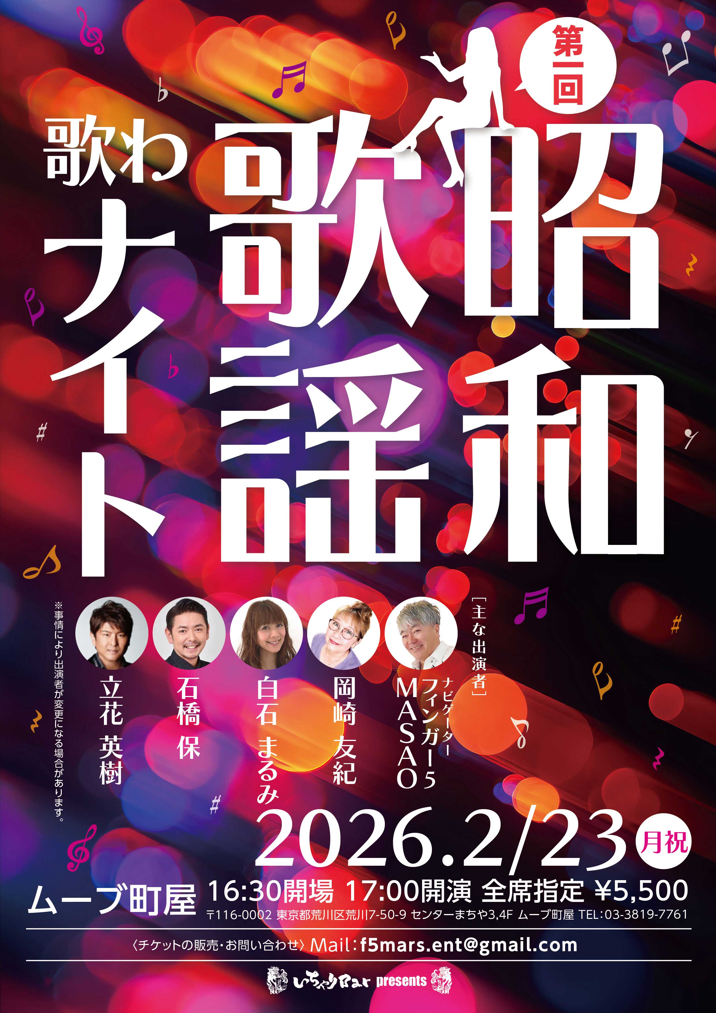 ※事情により出演者が変更になる場合があります。チケット 全席指定 5,500円 申し込み方法 件名に必ず「昭和歌謡 歌わナイト」とご記入の上、