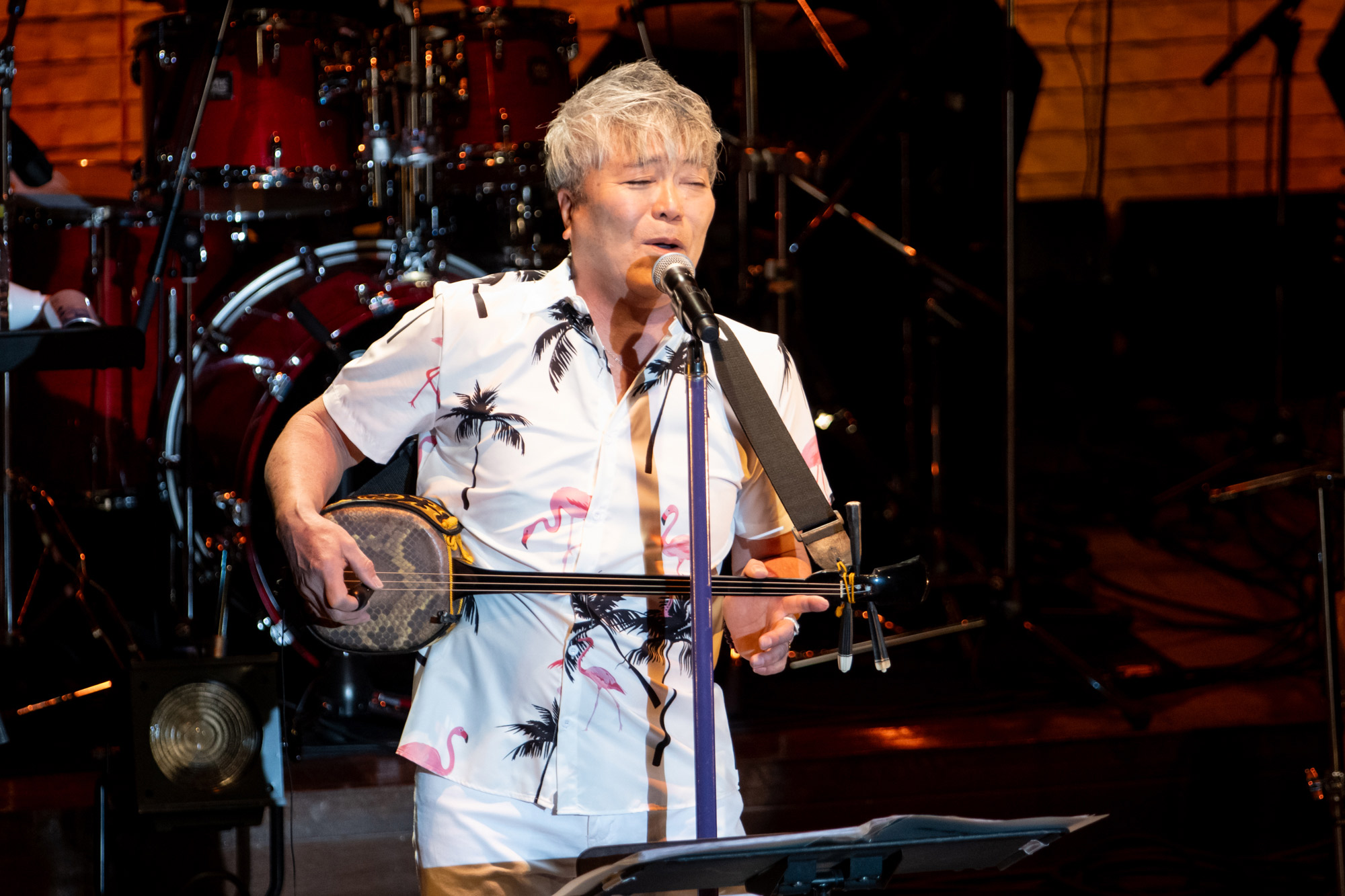 全編沖縄の方言で歌う満点の星、新たにリマスターしたカバーCDにも入っている片手に三線を、三線の花の3曲を演奏。